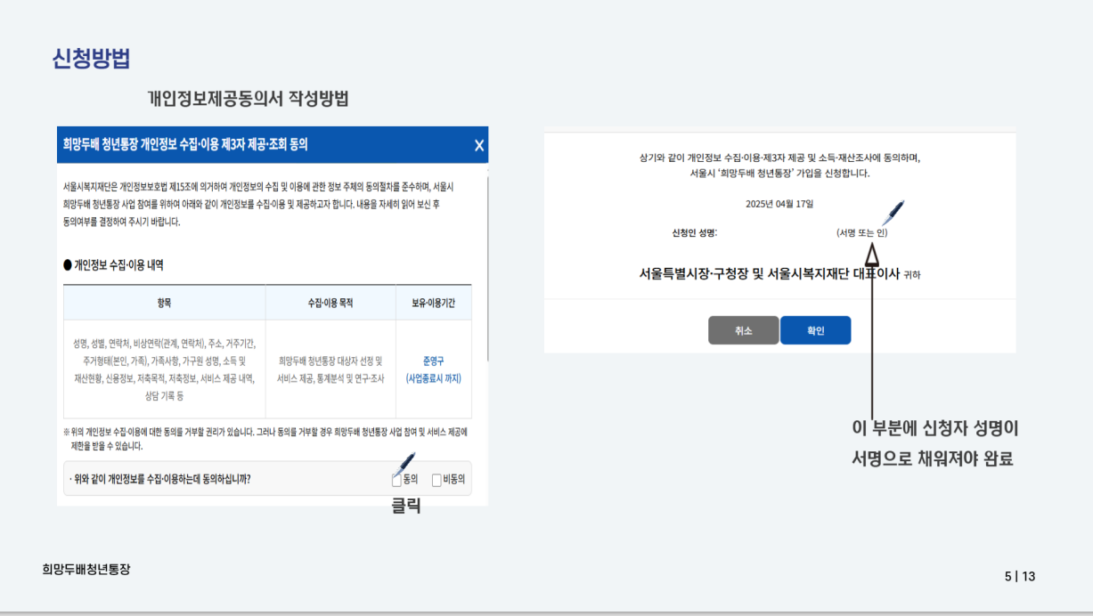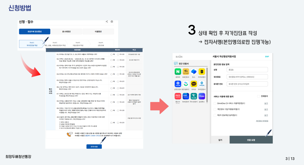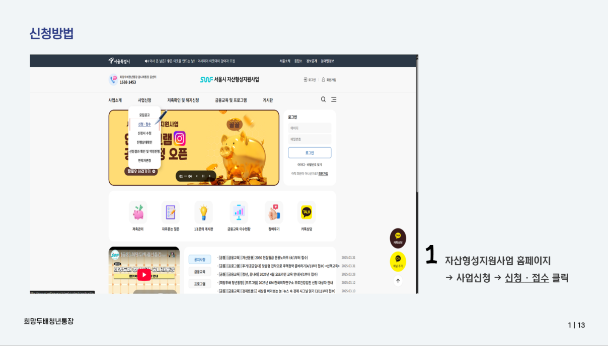 A. 기본적으로는 **서울복지포털(복지로)**를 통한 온라인 신청이 원칙이나, 동주민센터 방문 접수도 병행되며 연도별로 달라질 수 있습니다. - Q. 통장 운영 기간 도중 중도 해지하면 어떤 불이익이 있나요?