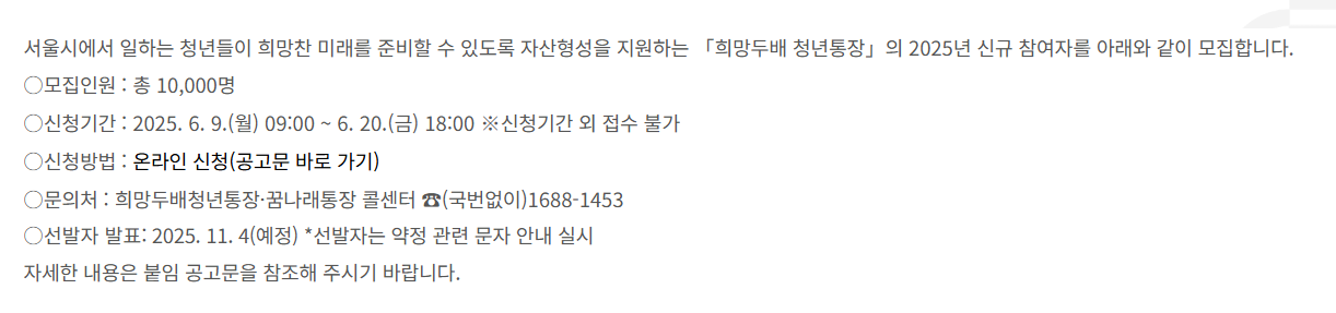 청년기의 재정 기반은 이후 삶의 질에 큰 영향을 미칩니다. 이제는 저축을 단순한 의무가 아닌, 내 미래를 위한 투자로 바라봐야 할 때입니다. 서울에 거주하며 해당 요건을 충족하는 청년이라면, 이 기회를 꼭 활용해보시길 바랍니다.