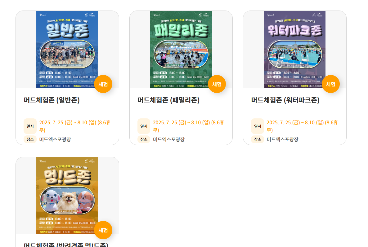 A: 매년 7월 말부터 8월 초까지 약 2주간 진행됩니다. 2025년 일정은 7월 25일부터 8월 10일까지입니다. - Q: 머드축제 입장료는 얼마인가요?