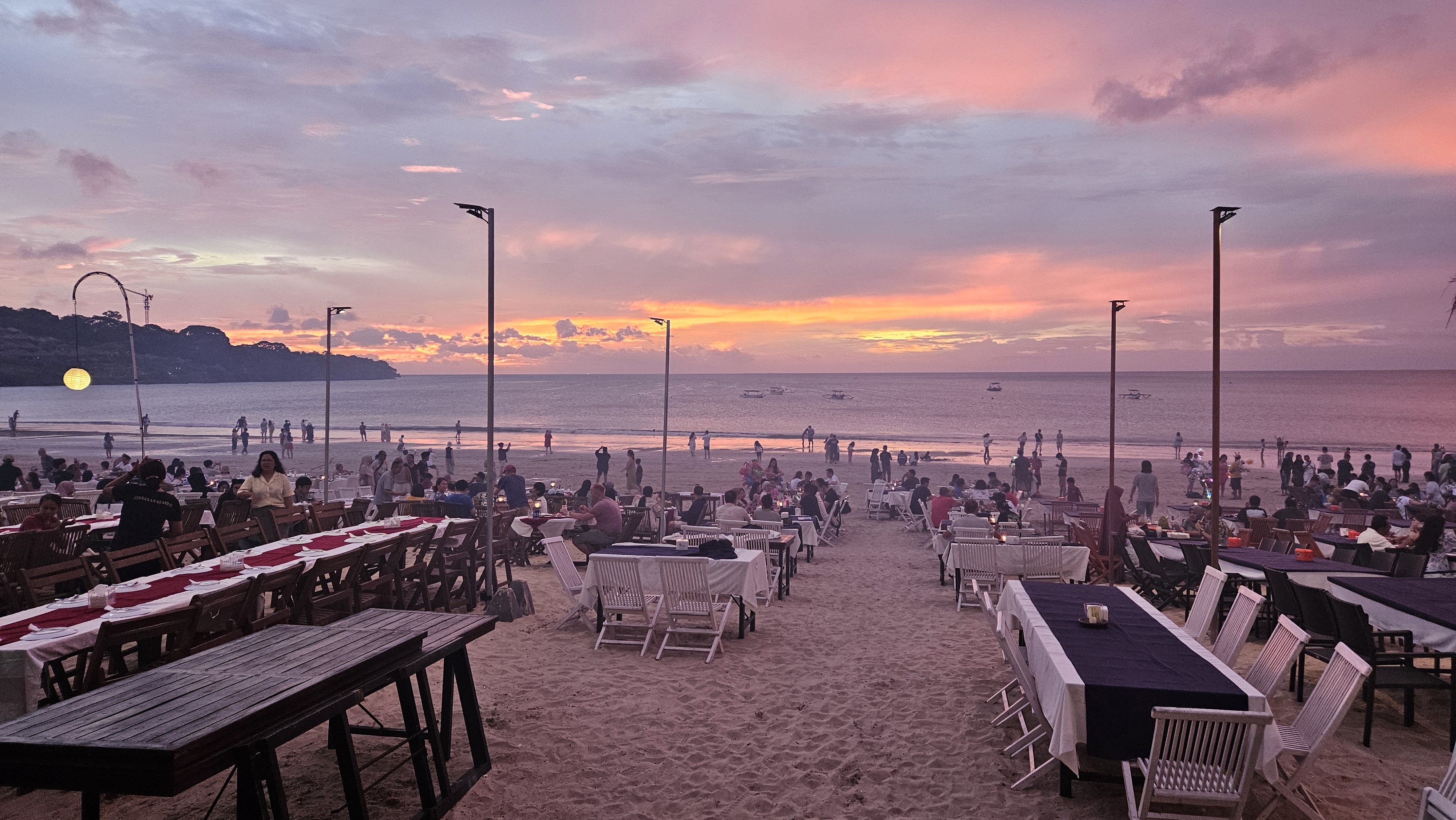 해변 모래 위에 테이블 세팅되어 있고, 석양을 바라보며 저녁 식사 가능해요. 분위기 하나만으로도 값어치 충분. 새우, 게, 조개, 생선 바비큐 플래터 추천합니다.