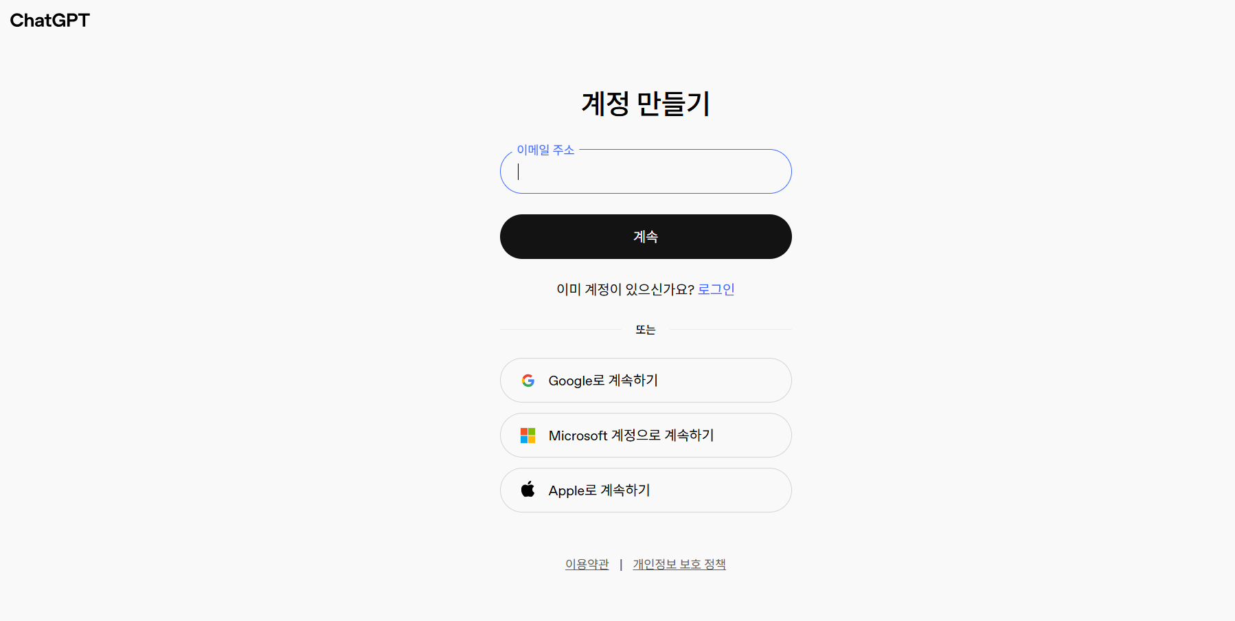 챗GPT를 사용하려면 OpenAI 계정이 필요합니다. 구글 계정이나 애플 계정으로도 손쉽게 가입할 수 있습니다.