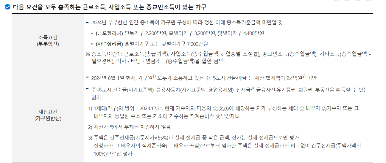 신청일 기준 가구원 전체의 재산 합계가 2.4억 원 미만이어야 합니다.