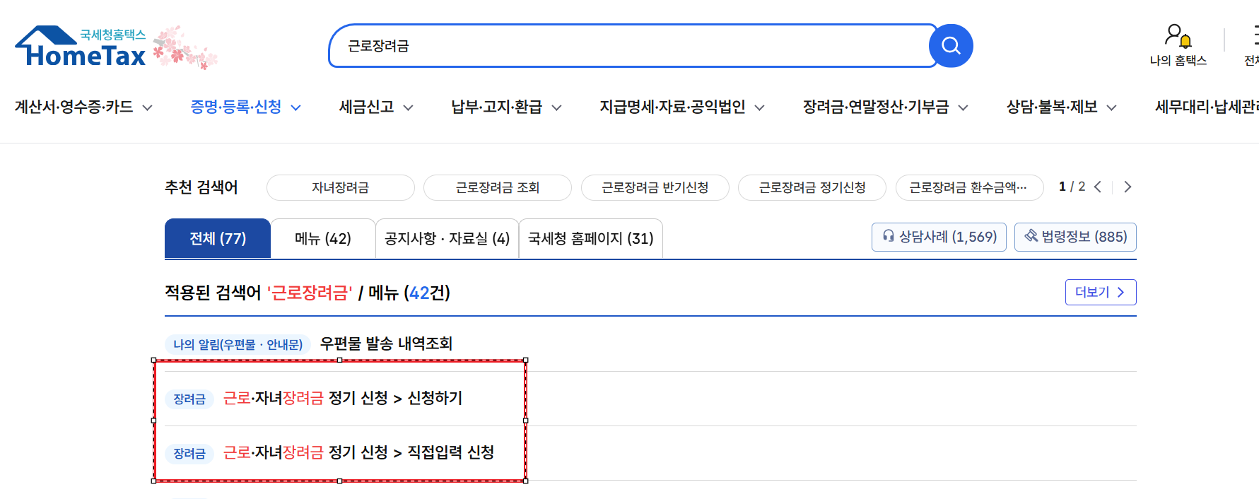 홈택스 로그인 후 근로장려금을 검색하시면 신청할 수 있는 페이지로 이동이 가능합니다.
