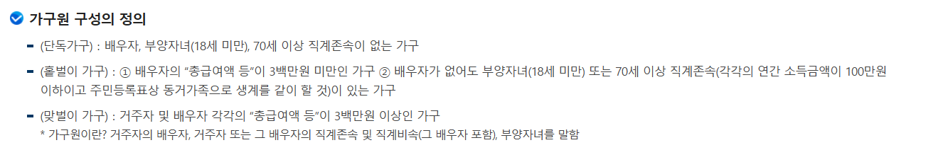 홑벌이 가구: 배우자의 소득이 없거나, 300만 원 미만이거나, 장애인 또는 고령자일 경우