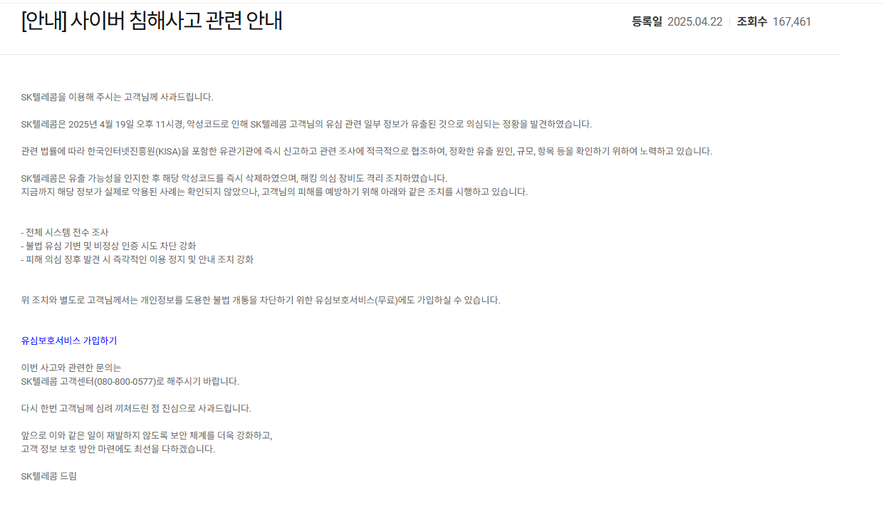 2025년 4월 중순, SK텔레콤은 외부 해킹 공격으로 인해 일부 고객 정보가 유출되었음을 공식적으로 인정했습니다. 현재까지 밝혀진 바에 따르면, 유출된 정보에는 고객의 이름, 휴대전화 번호, 생년월일, 주소, 이메일 등이 포함되어 있으며, 금융 정보(신용카드 번호나 계좌 번호)는 유출되지 않았다고 밝혔습니다.