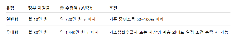A: 일반형은 매달 10만 원, 우대형은 매달 30만 원을 지원합니다. 3년 만기 시 각각 약 720만 원, 1,440만 원 + 이자를 수령할 수 있습니다.