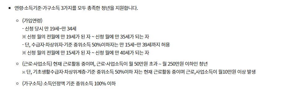 청년 내일 저축계좌는 누구나 가입할 수 있는 제도가 아닙니다. 다음과 같은 조건을 모두 충족해야 신청이 가능합니다.