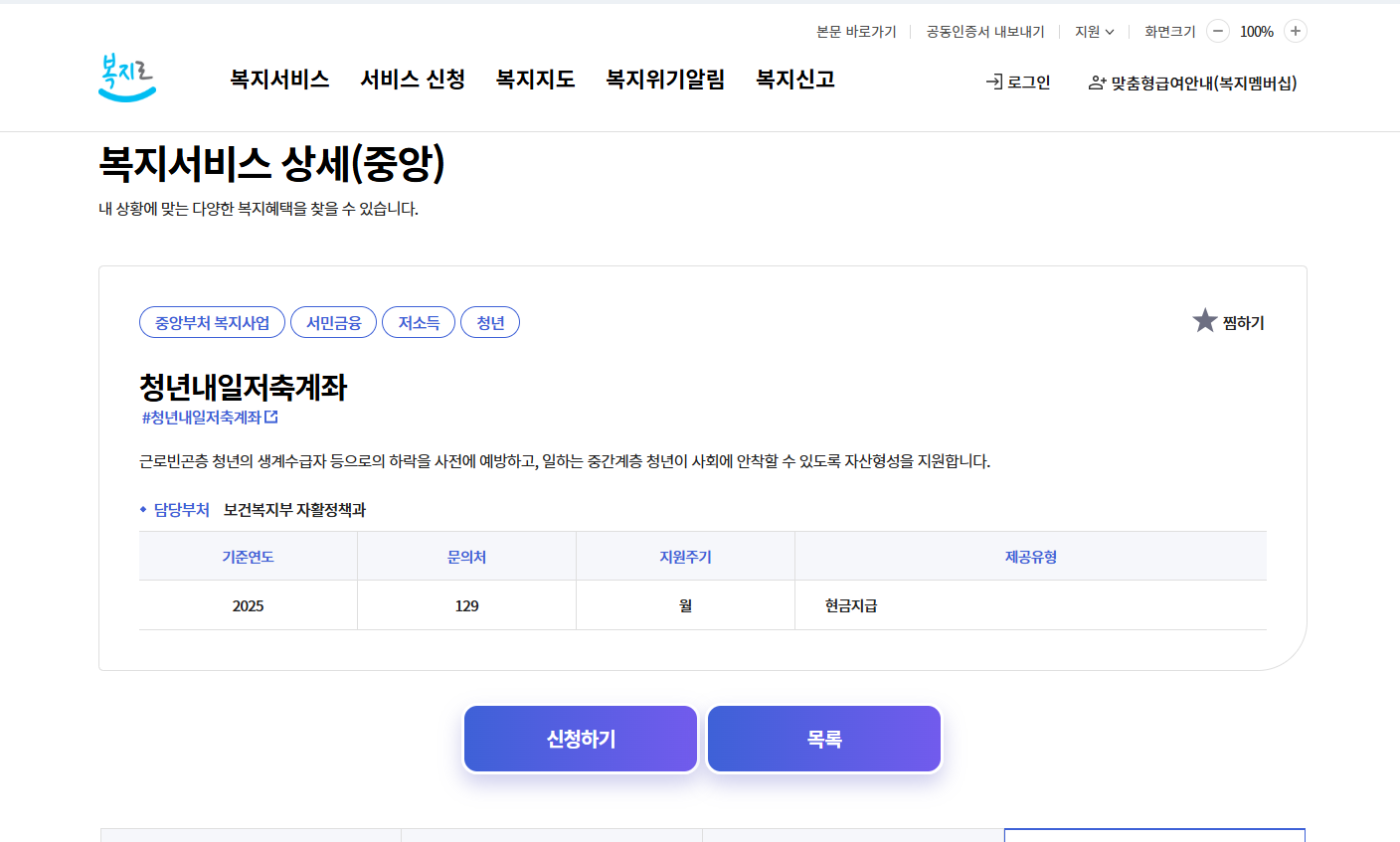 청년 내일 저축 계좌는 기준 중위소득 100% 이하의 만 19세~34세 청년이 대상입니다.