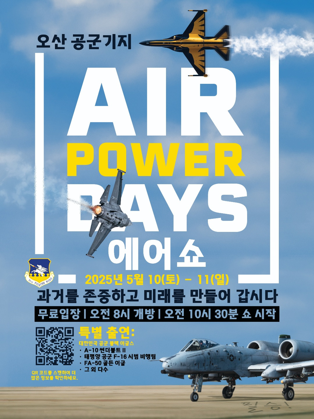 A: 2025년 5월 10일(토)과 11일(일), 오전 9시부터 오후 5시까지 경기도 평택시 오산 공군기지에서 열립니다.