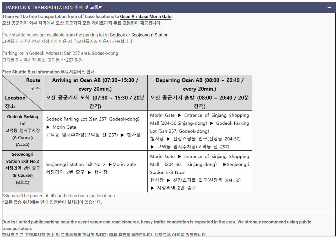 오산 공군기지 에어쇼 참석을 위한 교통편과 주차 정보도 꼼꼼히 체크하세요. 기지 내부 주차는 제한적이므로 대부분의 방문객은 기지 외부 지정 주차장을 이용한 후 셔틀버스를 타고 이동해야 합니다.