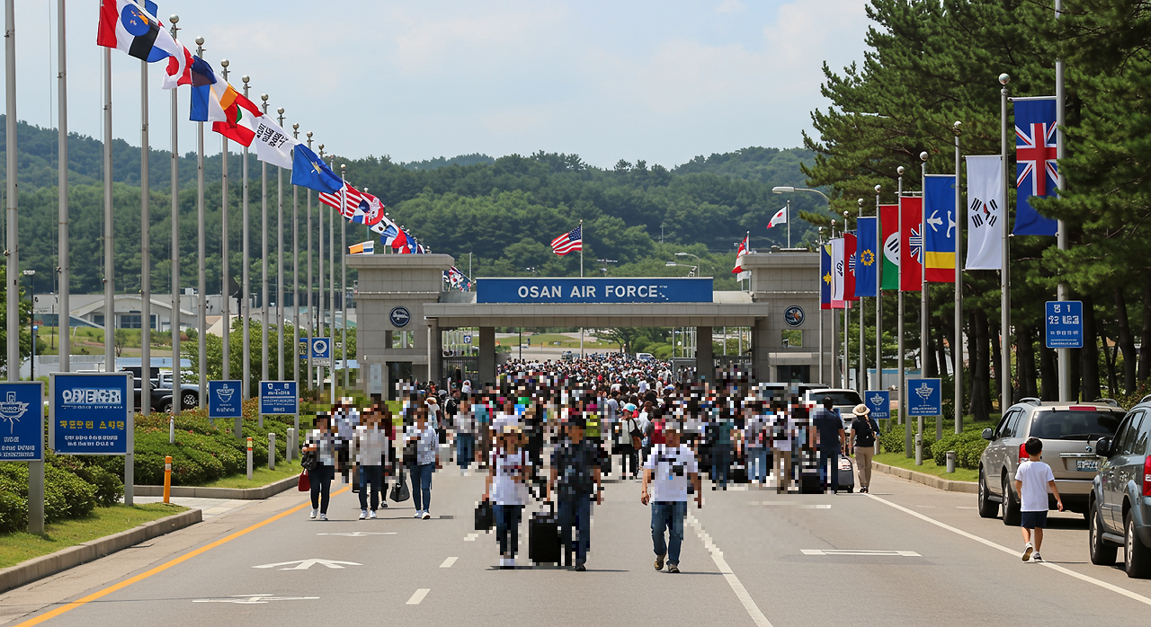 A: 일반 관람객은 오산 공군기지의 모린 게이트(Morin Gate)를 통해 입장합니다. 다른 출입구로는 입장이 제한됩니다.