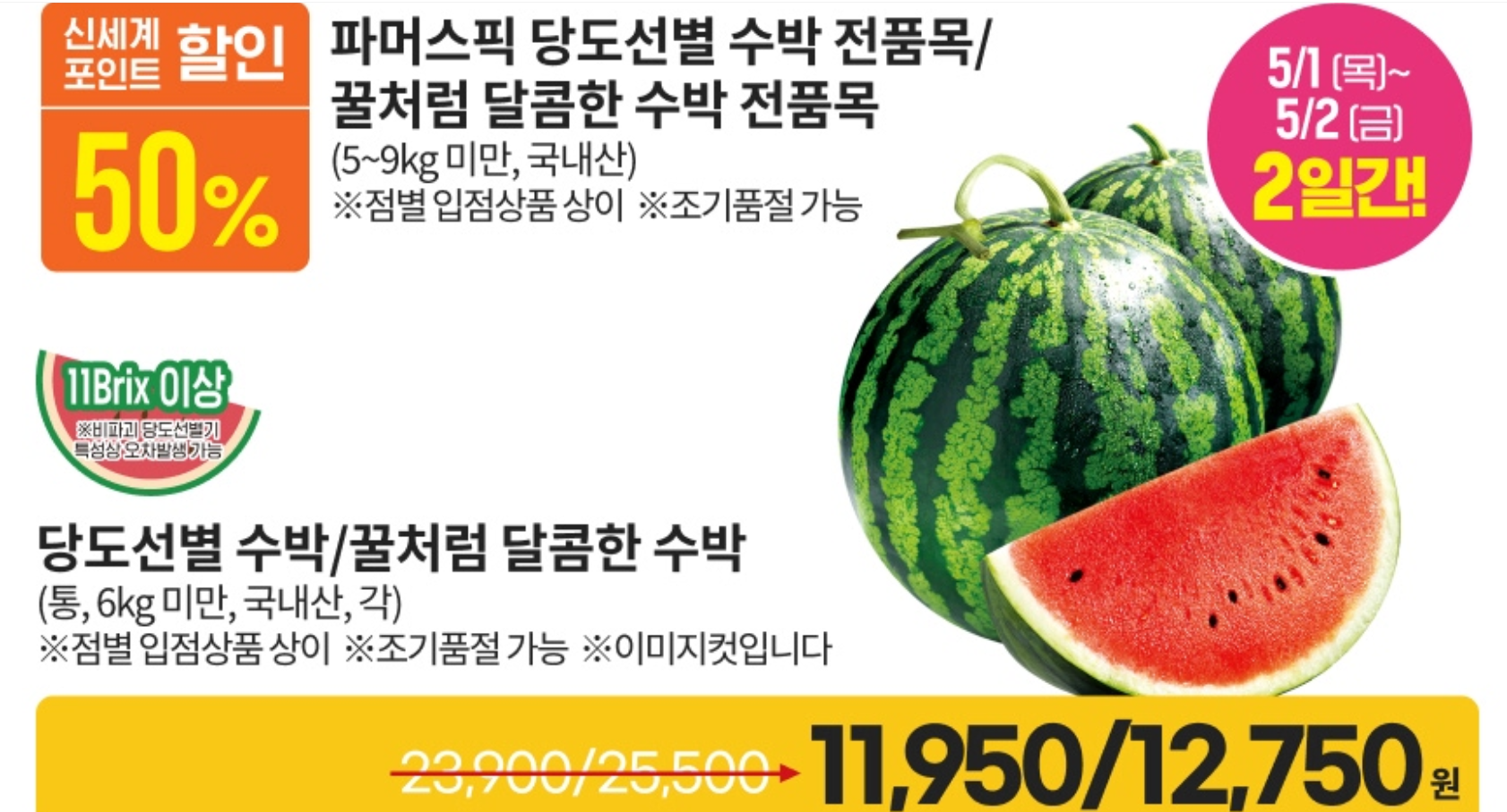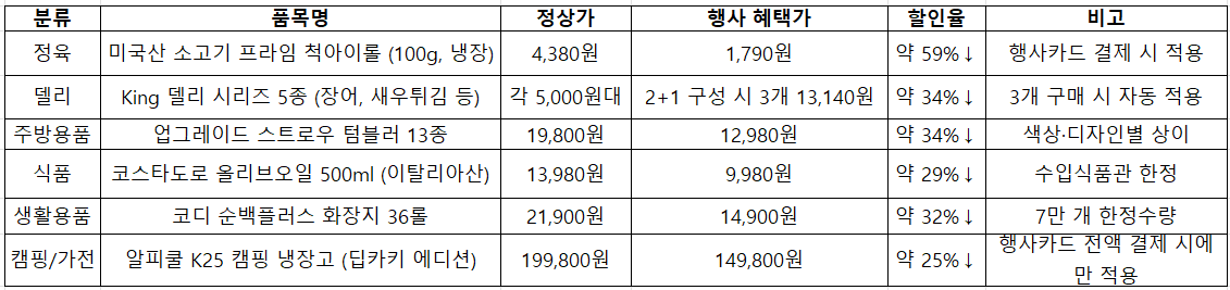 - 할인 상품은 행사카드(삼성/현대/KB국민 등)로 결제 시 추가 할인 적용