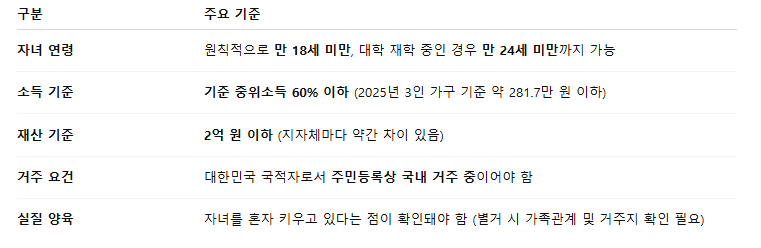 한부모가정이 복지 혜택을 받으려면 자녀의 연령, 소득·재산 기준, 실질 양육 여부를 충족해야 합니다.