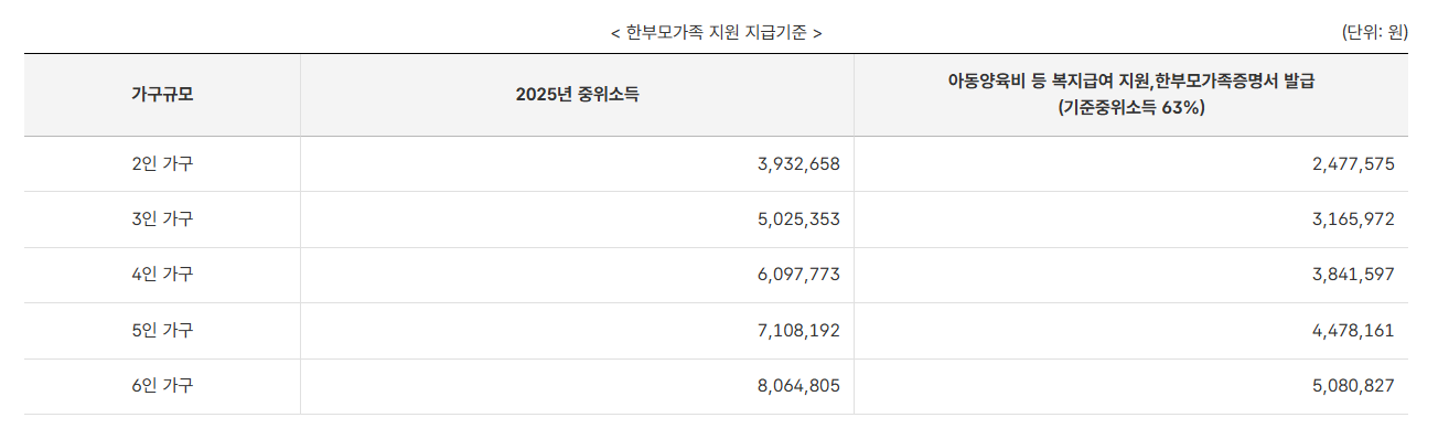 이 기준 이하의 소득을 가진 한부모가정이 지원 대상이 됩니다. 다만, 건강료 납부액, 자동차 소유 여부, 부동산 보유 현황 등도 함께 고려되므로, 실제 지원 가능성은 소득인정액 기준으로 따져야 합니다.