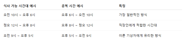 간헐적 단식 16:8은 다양한 시간대로 조정이 가능합니다. 본인의 생활 패턴에 맞게 식사 가능 시간을 선택하는 것이 좋습니다.