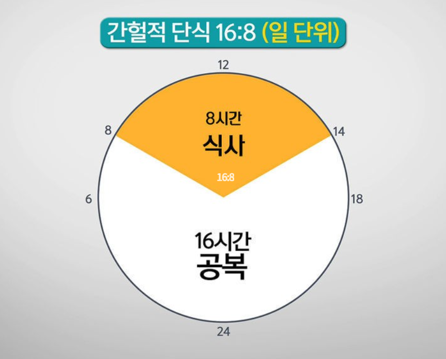 간헐적 단식(Intermittent Fasting)은 하루 중 일정 시간 동안 음식을 섭취하지 않고 공복을 유지하는 식이 요법입니다. 16:8 방식은 24시간 중 16시간은 공복을 유지하고, 8시간 안에 식사를 마치는 방식입니다. 예를 들어 오전 10시에 첫 끼를 먹고 오후 6시에 마지막 식사를 끝내면, 이후부터 다음 날 오전 10시까지 16시간 동안은 아무것도 먹지 않고 공복 상태를 유지하게 됩니다.