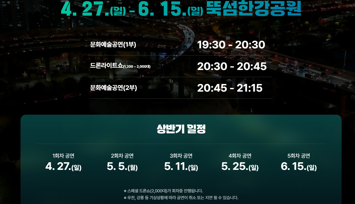 - 드론 라이트 쇼 본공연: 20시 30분부터 20시 45분 (약 15분간 진행)