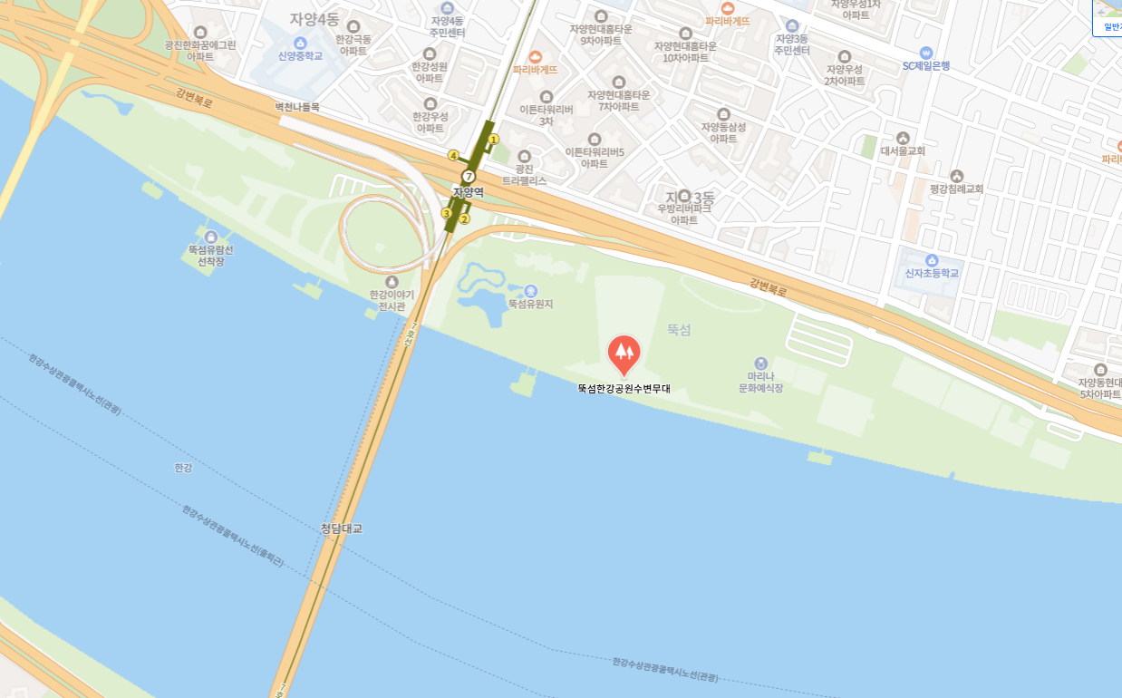 대중교통: 서울 지하철 7호선 뚝섬유원지역 2번 출구에서 도보 약 10분 소요됩니다.