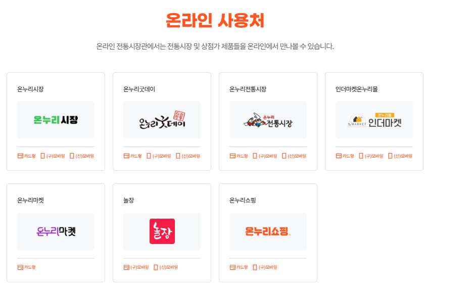 - 제휴된 온라인 전통시장 쇼핑몰 (모바일·카드형 한정)