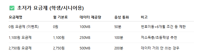 - 저렴한 요금제: 동일한 데이터·통화량 기준으로 대형 통신사 대비 평균 20~50% 저렴합니다.