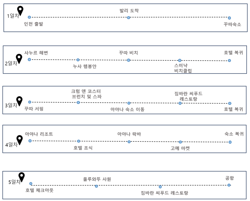 발리 4박 5일 일정은 짧다면 짧지만, 이렇게 짜면 알차고 완벽한 코스로 만들 수 있습니다. 자유여행 또는 신혼여행, 친구와의 여행 모두 만족할 일정이에요!