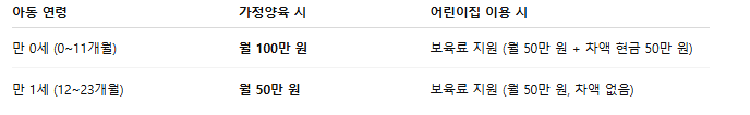 어린이집에 다니는 경우 보육료로 일부 또는 전액 지원되며, 만 0세 아동의 경우 차액 현금 지급이 가능합니다.