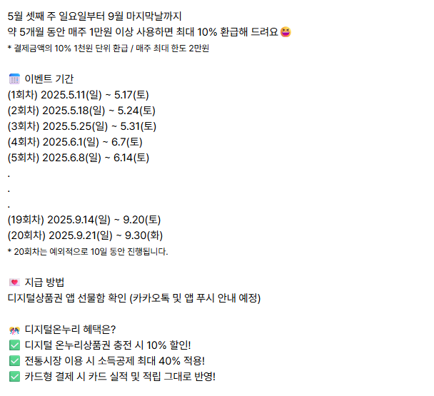 이번 환급 제도는 2025년 5월 13일(월)부터 9월 30일(화)까지 약 20주간 한시적으로 운영됩니다. 기간 내 온누리상품권을 꾸준히 사용하면 최대 20만 원까지 환급받을 수 있습니다.