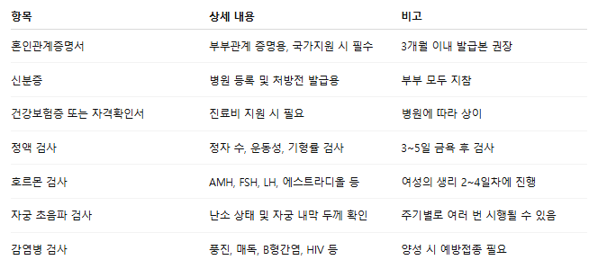 시험관 시술은 법적인 부부만 받을 수 있으며, 병원에서는 아래와 같은 서류 및 검사를 요구합니다.