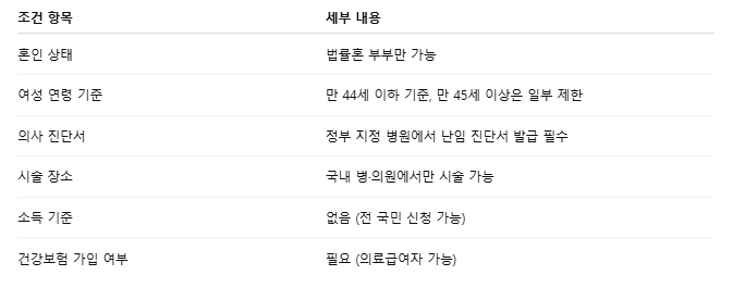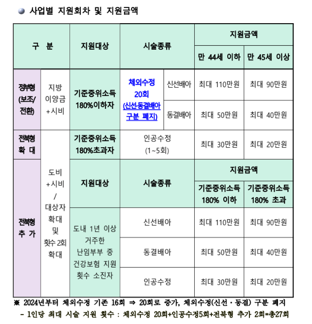- 여성 연령 기준 만 44세 이하 (만 45세부터는 횟수 제한 및 지원 금액 축소)