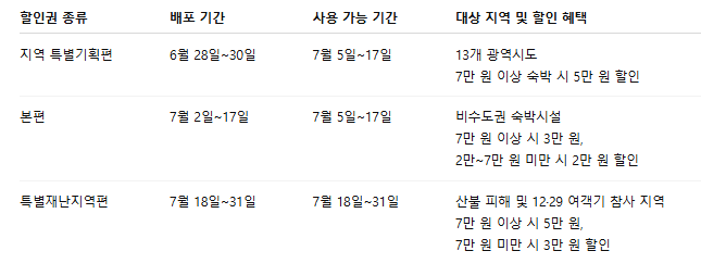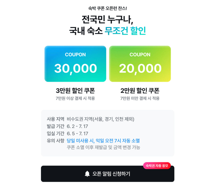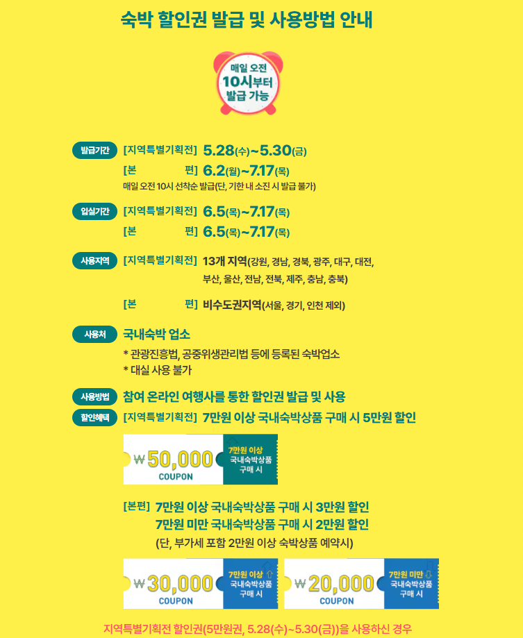 다음으로 진행되는 ‘본편’ 할인권은 수도권(서울, 경기, 인천)을 제외한 비수도권 지역 숙박시설을 대상으로 합니다. 7월 2일부터 17일까지 배포되며,