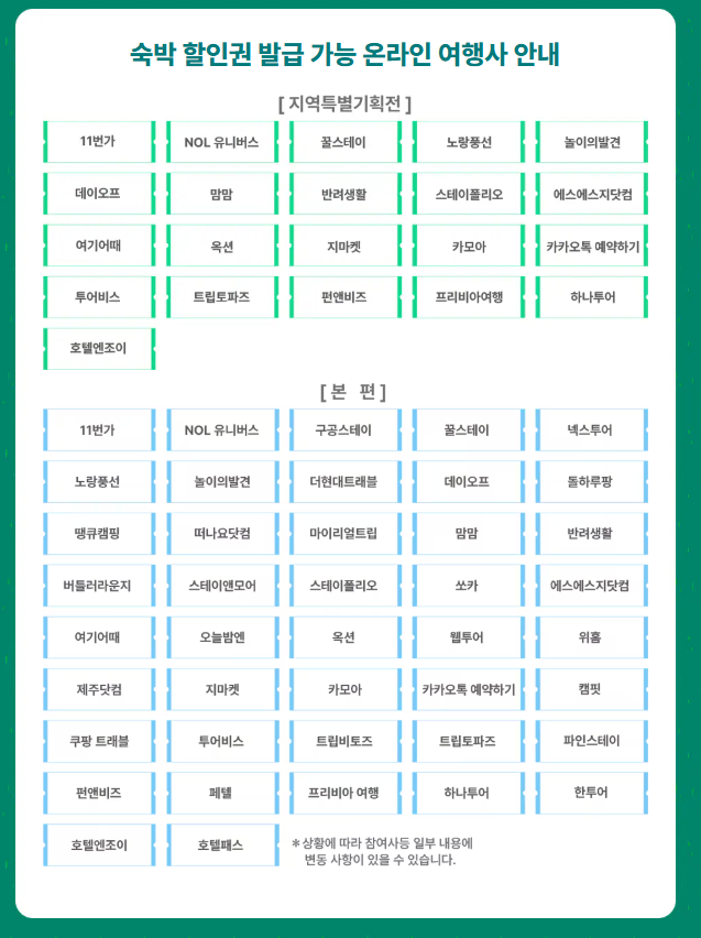 - 할인권 적용 대상 숙박시설은 호텔, 콘도, 리조트, 펜션 등 등록된 국내 숙박시설에 한함