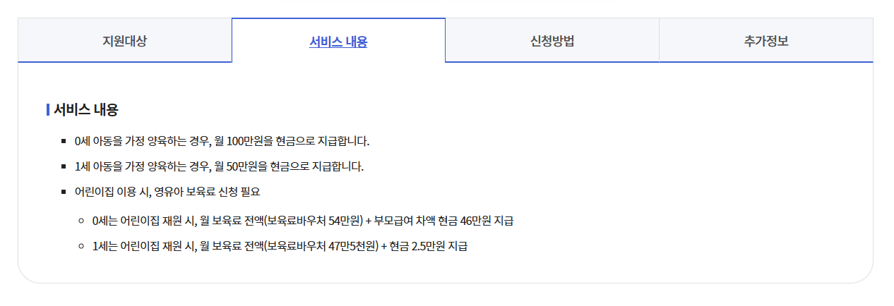 | 1세 | 월 50만 원 (현금) | 보육료 지원 (현금 없음) |