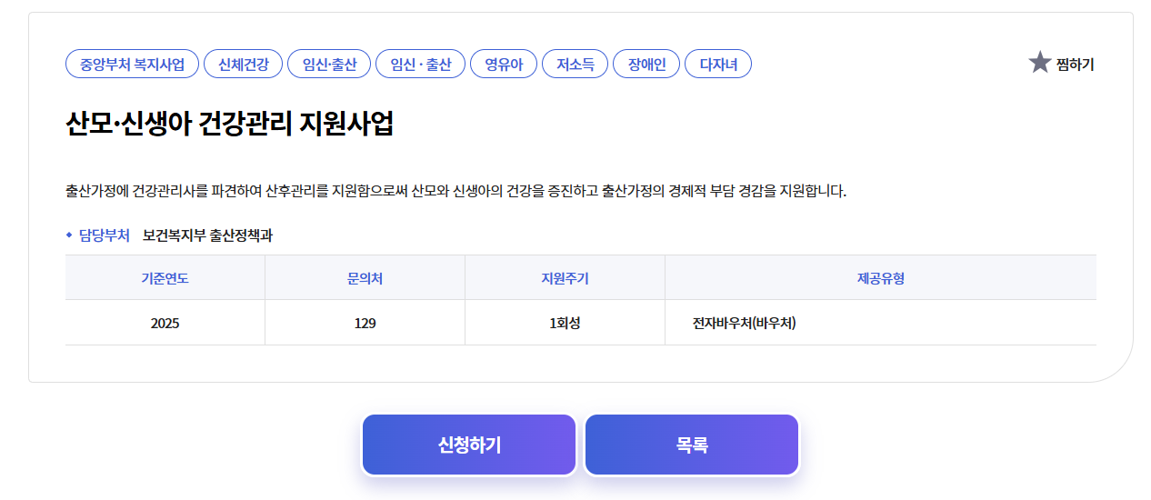 - 방문 신청: 산모의 주민등록 주소지 관할 보건소